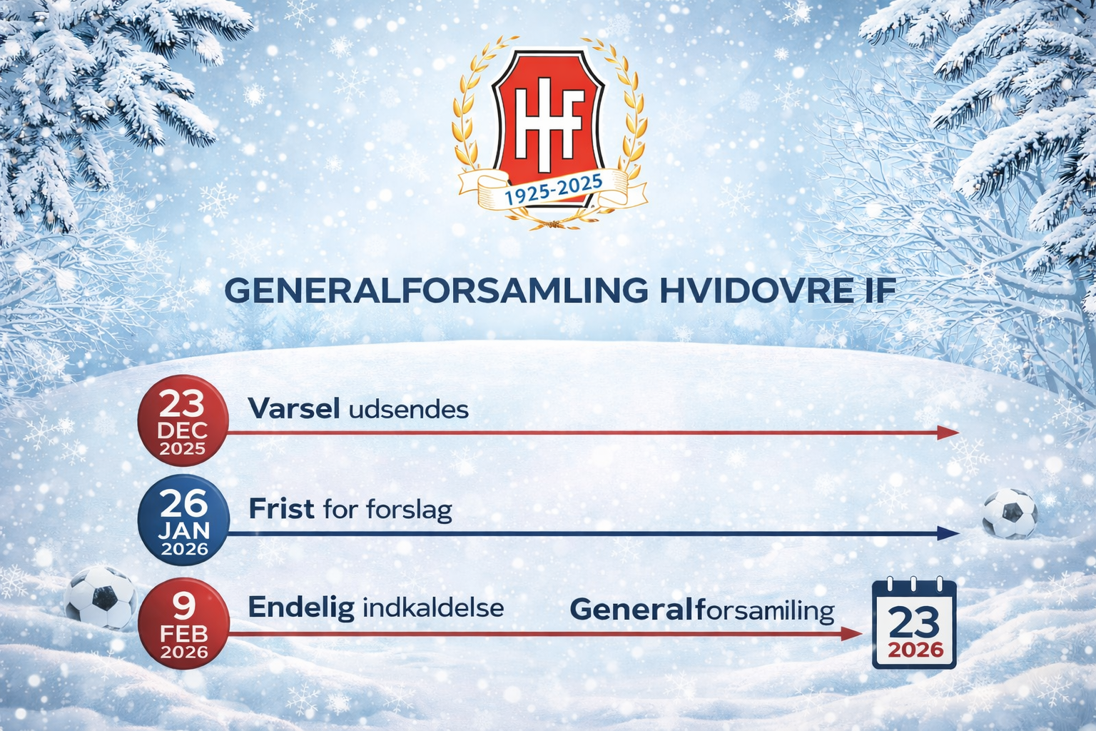 Hermed fremsendes endelig indkaldelse til ordinær generalforsamling i Hvidovre IF, fodboldafdelingen, som afholdes mandag den 23. februar 2026 kl. 19.00, i stadionrestauranten.